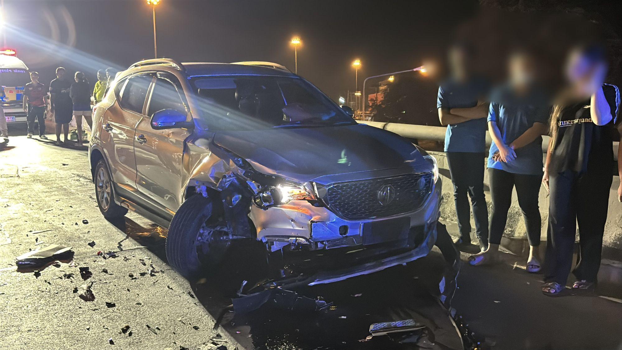 キティサック氏の警察への供述によると、彼はノンプルー地区の自宅に向かって運転していたところ、橋に着いた途端、反対方向から猛スピードでバイクが突然接近してきたという。バイクは制御を失い、車線を横切ってキティサック氏の車に正面衝突したという。衝突後、キティサック氏はすぐに車を停めてバイクの運転手の様子を確認したところ、意識を失い、動けない状態だった。