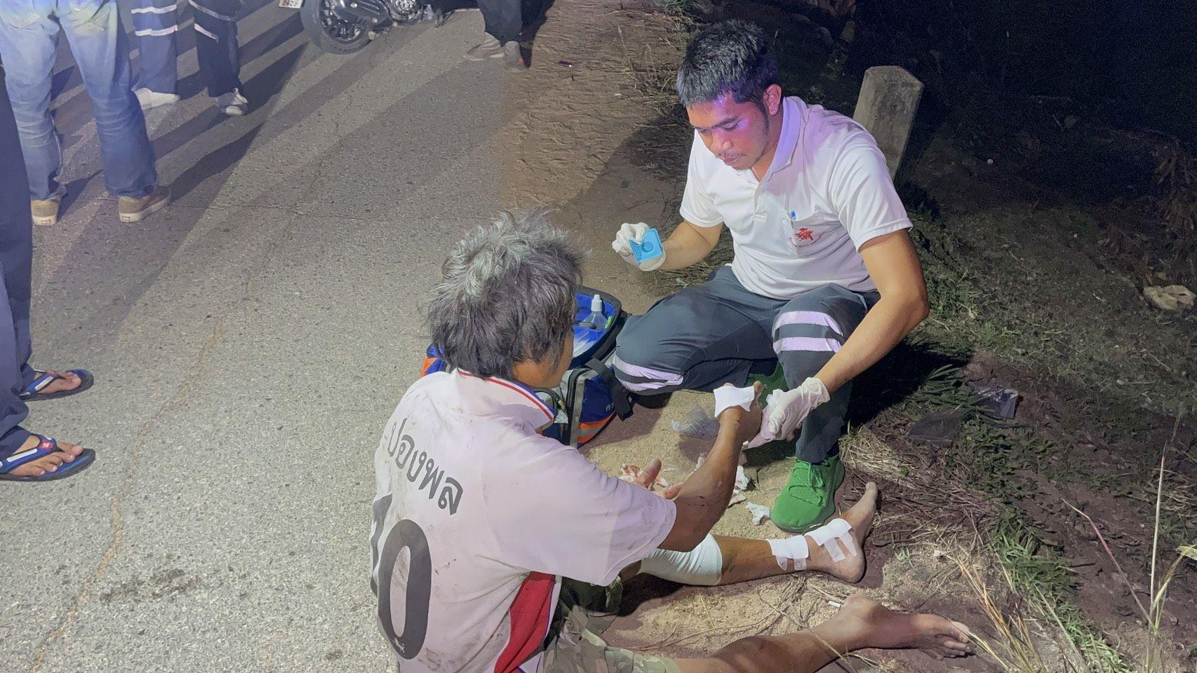 現場に到着すると、ダム道路の端から外れて貯水池に転落し、損傷を受けた紫色のホンダ・ウェーブ100型バイクが発見された。運転手はクンチャー・プランディー氏(50歳)と確認され、近くにいたところ、全身に軽度の擦り傷を負っていた。救助隊員は直ちに応急処置を施した。